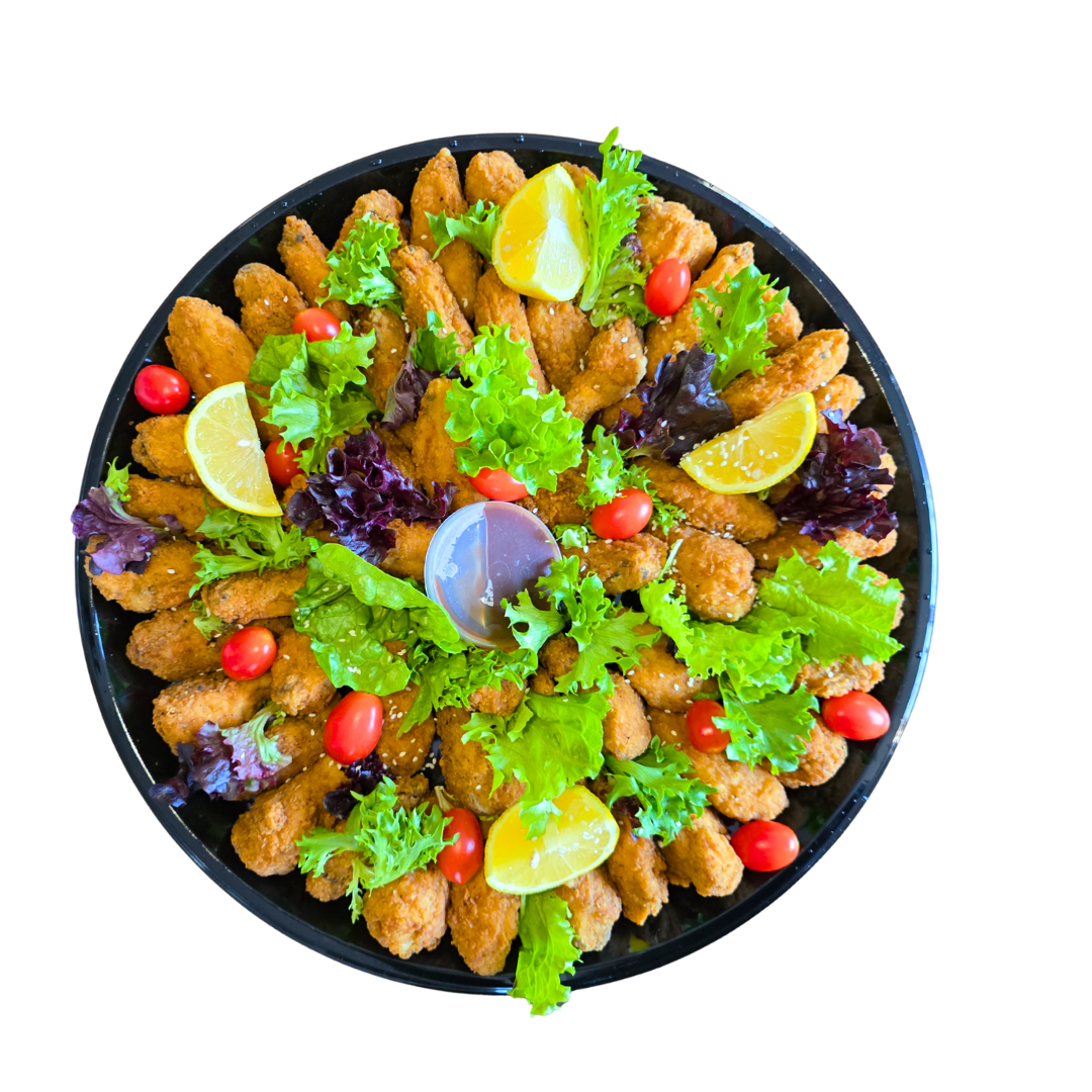The Wing Platter features 50 crumbed buffalo wings and a delicious mayo dip. Perfect for parties or events, this platter is sure to satisfy even the biggest wing lovers. Enjoy the crispy texture and spicy flavor of our buffalo wings, paired with creamy mayo for a tasty and satisfying snack.